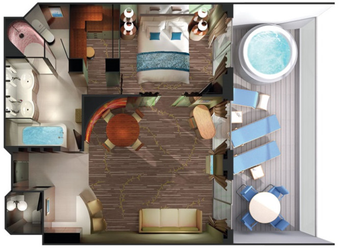 S5 - Deluxe Owner's Suite 128 m² / balkón 45 m². 12. paluba - vpredu. Max 4 osoby. Výhody Suite. 15 828 € 7 914 € za osobu